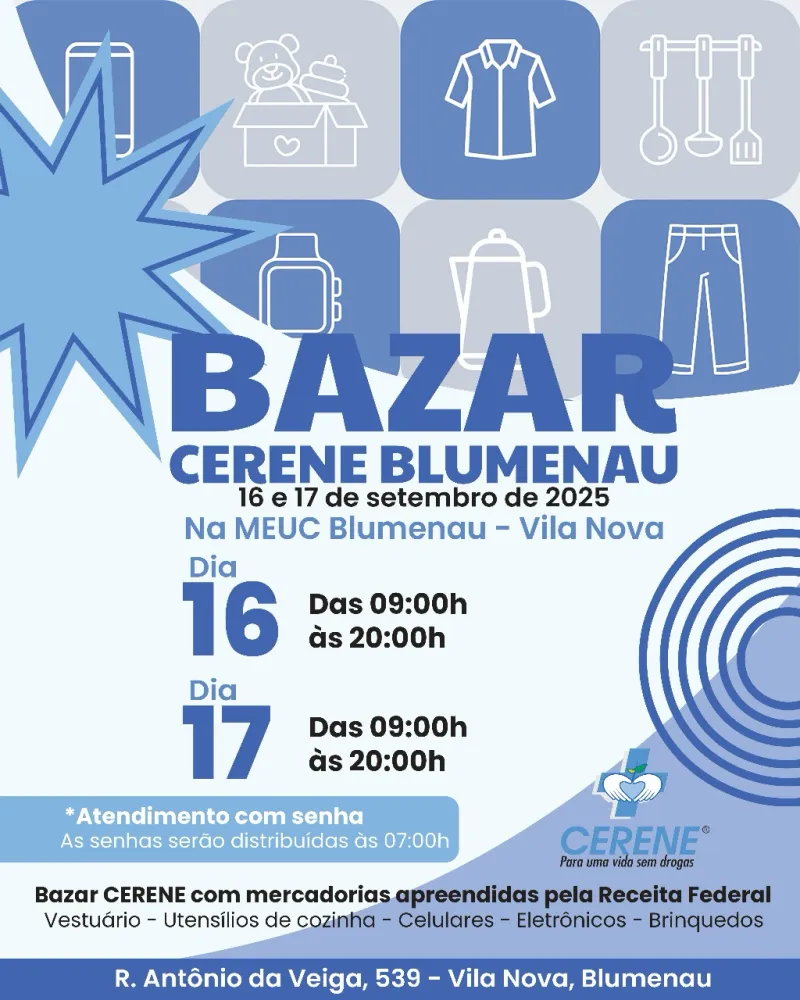 Nos dias 16 e 17 de setembro, o Centro de Recuperação Nova Esperança (Cerene) promove um bazar especial em Blumenau com produtos oriundos de apreensões da Receita Federal. O evento acontece na Igreja Missão Evangélica União Cristã, na Rua Antônio da Veiga, nº 539, no bairro Vila Nova.