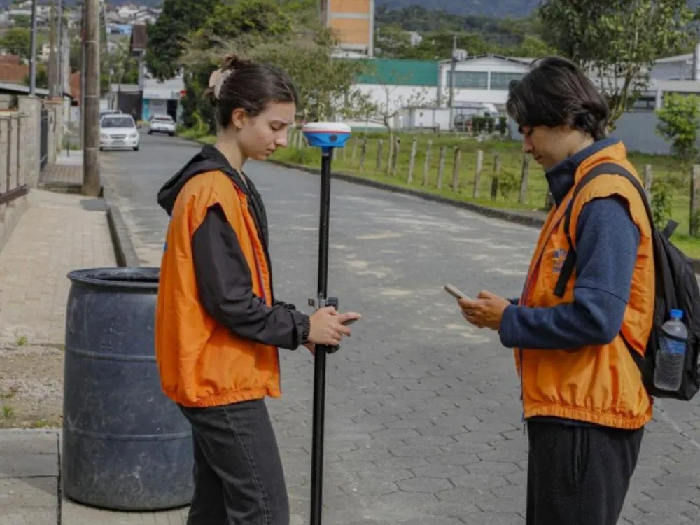 O trabalho é conduzido por professores e estudantes do Centro de Ciências Tecnológicas da FURB, que percorrem os bairros utilizando um equipamento de alta precisão, o RTK (Real Time Kinematic). Esse sistema permite coletar dados topográficos e de altitude com base em sinais de satélite, possibilitando comparações detalhadas com registros anteriores e identificando com exatidão os níveis de alagamento por cota.