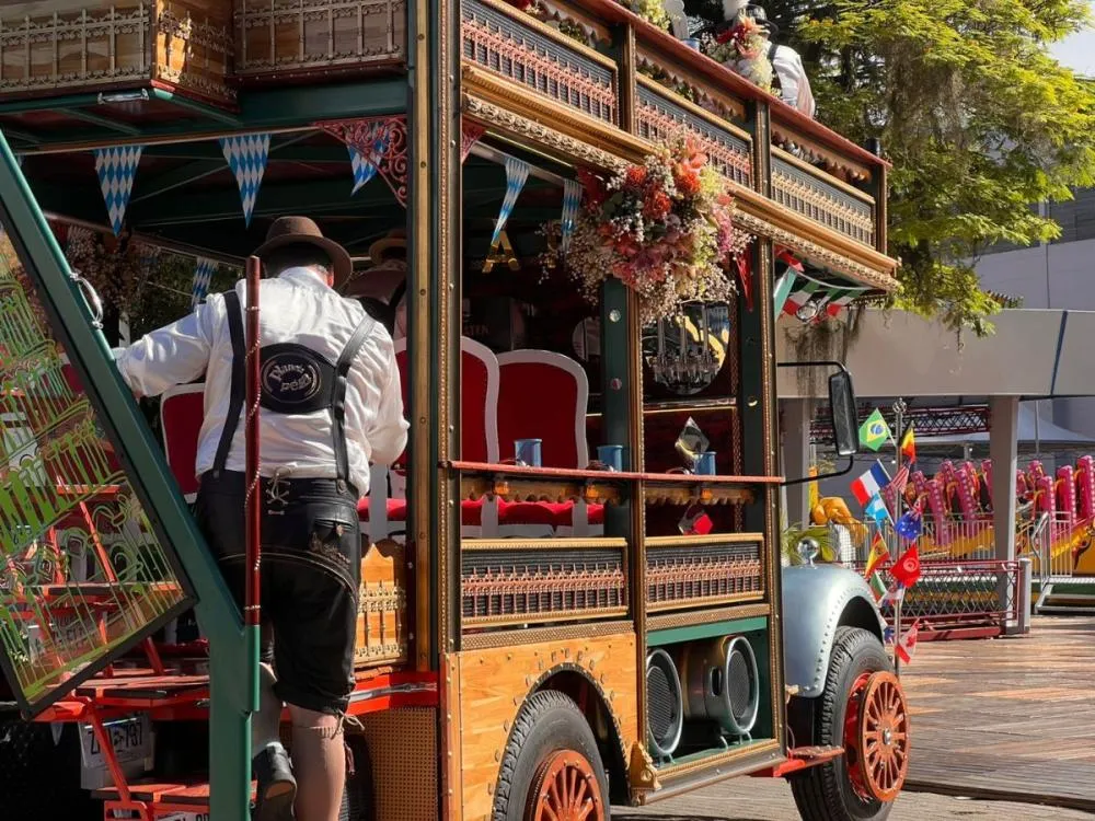 "O Planetapeia completa 38 anos e a nossa história, ela sempre está muito junto às tradições, à cultura alemã. Esse brinquedo eu fiz para homenagear a condução de autoridades e personalidades. Ele é bem lúdico, é um caminhão 1957 Mercedes. Esse tipo de caminhão ele tinha um apelido de torpedo na época. Nesse carro, o chope vem pelo teleférico. Foi feito com espírito de alegria, assim como a nossa festa", explica.