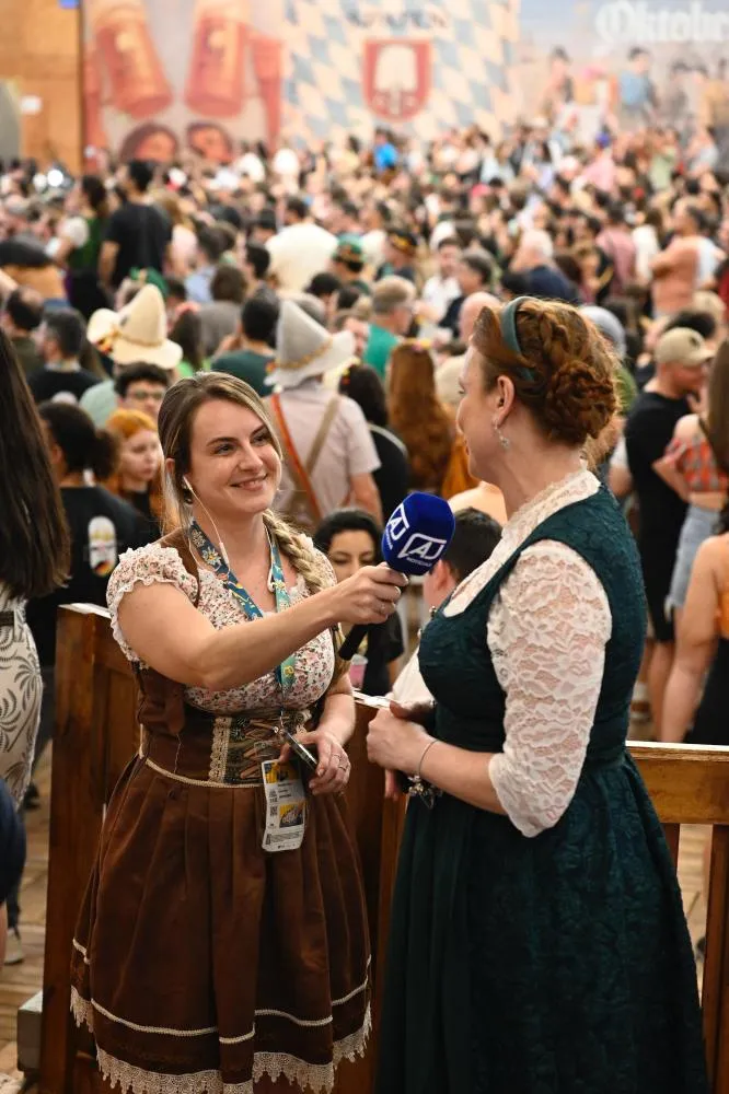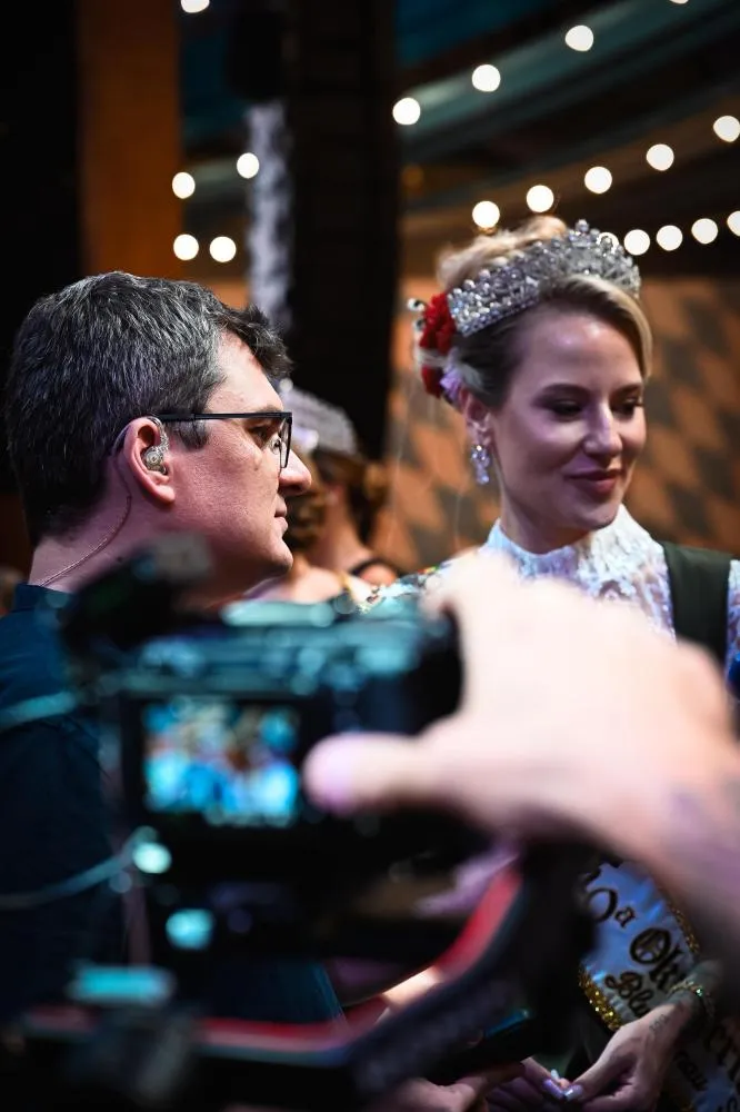 A transmissão destacou o anúncio da rainha Letícia Zonta, de 32 anos, da 1ª princesa Nicoli Heinzen Lucas Gassen, de 24 anos, e da 2ª princesa Luana Oenning, de 26 anos. O trio eleito passará a representar Blumenau e a Oktoberfest 2026 em eventos e ações de divulgação ao longo do próximo ano.