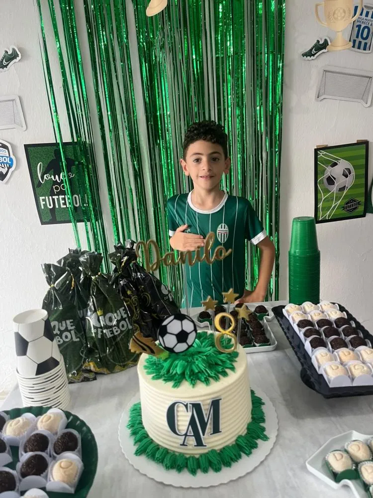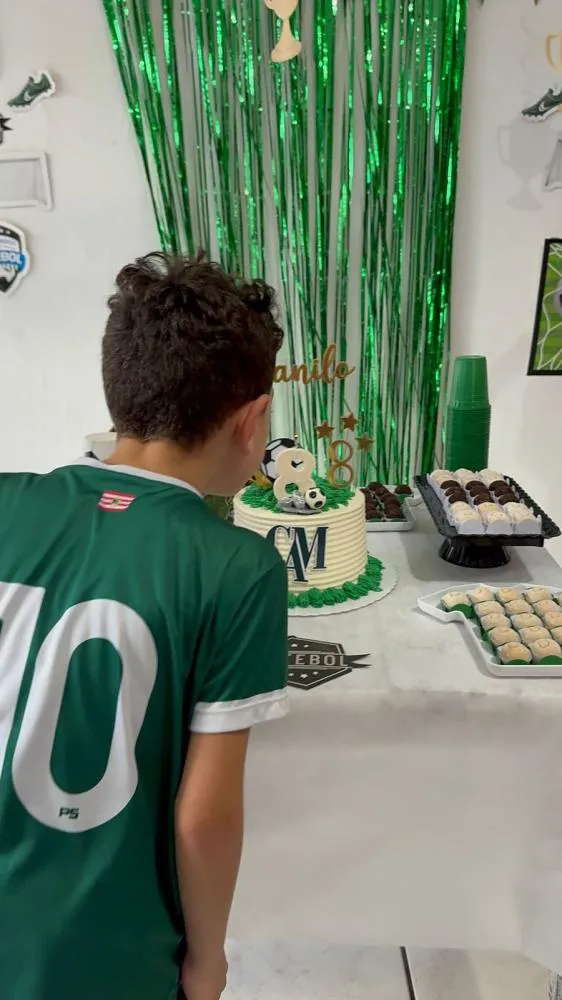 A festa de aniversário do garoto ficou tomada pelas decorações verdes, uniformes do Metrô e até um bolo personalizado do clube.