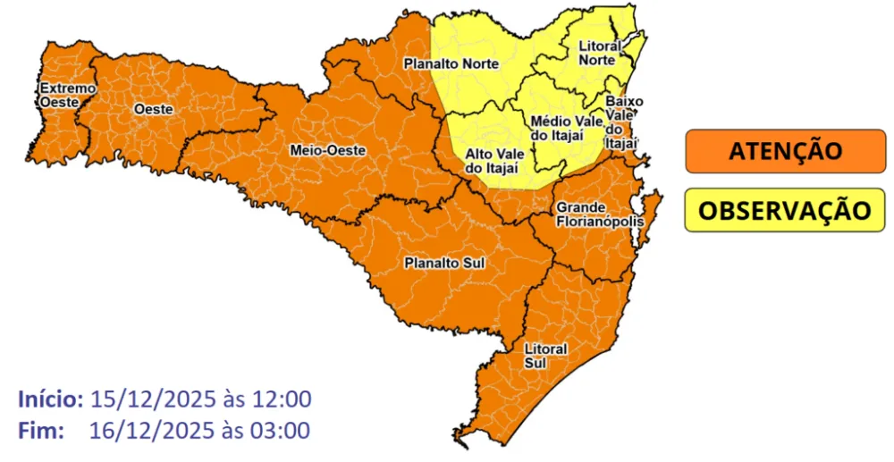 As áreas mais afetadas serão o Oeste e o Extremo Oeste, especialmente nas regiões de divisa com o Rio Grande do Sul, onde o risco é considerado alto. No Litoral Sul, Grande Florianópolis e Baixo Vale do Itajaí, os temporais também podem ser intensos a partir do fim da tarde desta segunda. Já no Alto Vale do Itajaí e Norte catarinense, as instabilidades tendem a ser mais fracas, concentrando-se entre a tarde e a noite de terça-feira.