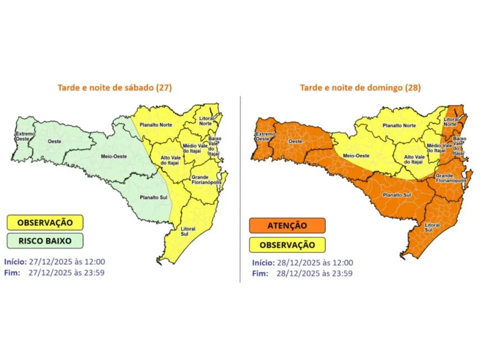Entre as tardes e noites deste sábado (27) e domingo (28), Santa Catarina segue com condições favoráveis à ocorrência de temporais localmente intensos, segundo alerta da Defesa Civil. O risco varia conforme a região: alto nas áreas em laranja, moderado nas áreas em amarelo e baixo nas áreas em verde, podendo provocar destelhamentos, quedas de galhos e árvores, danos na rede elétrica, alagamentos e enxurradas pontuais.