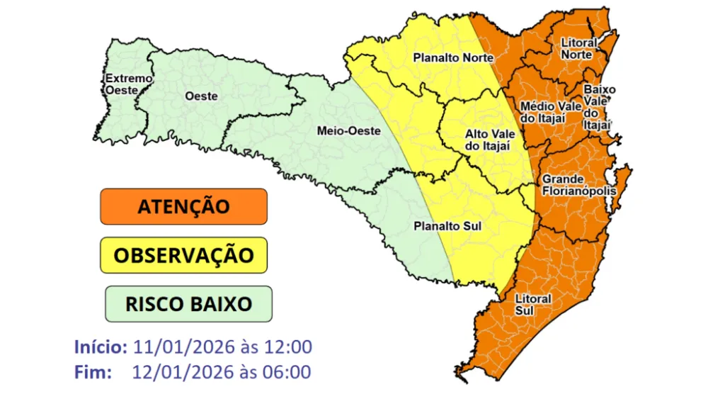 Segundo a Defesa Civil de Santa Catarina, o risco de ocorrências relacionadas a destelhamentos, quedas de galhos e árvores, danos na rede elétrica, alagamentos e enxurradas pontuais é moderado a alto nessas áreas. Já o Oeste do estado apresenta instabilidade menor e mais irregular, com risco baixo para ocorrências.