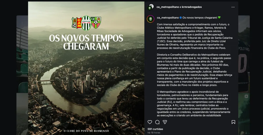 O Metropolitano também agradeceu o apoio de torcedores, patrocinadores e parceiros e destacou que o deferimento da recuperação judicial simboliza o início de uma nova fase para o clube.