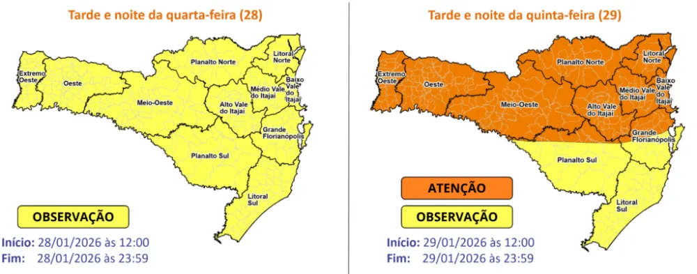 Já na quinta-feira (29), a previsão indica intensificação dos temporais, com chuva intensa acompanhada de raios, rajadas de vento e eventual queda de granizo. As áreas com maior atenção são o Grande Oeste, Planalto Norte, Vale do Itajaí, Litoral Norte e Grande Florianópolis. Neste dia, o risco é alto para alagamentos, enxurradas e destelhamentos, e moderado para queda de galhos e árvores e danos à rede elétrica.
