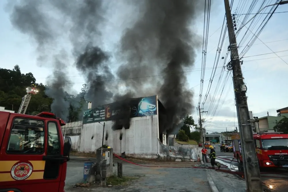 Equipes de emergência de três cidades do Vale do Itajaí seguem combatendo um incêndio de grandes proporções que atinge um imóvel na rua Samuel Morse, no bairro Fortaleza, em Blumenau, nesta sexta-feira (6). Segundo o Corpo de Bombeiros Militar, o imóvel abriga uma revenda de autopeças no piso térreo e uma residência no segundo andar.