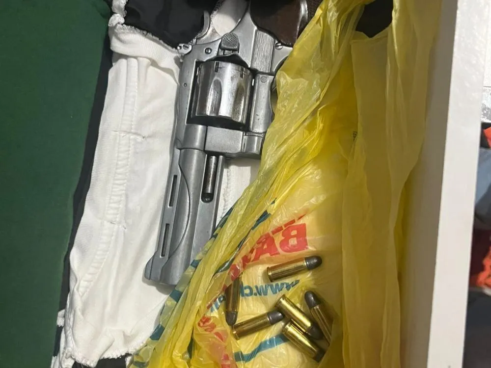 Durante o cumprimento do mandado, os policiais realizaram buscas na casa do rapaz. No local, a equipe encontrou uma arma de fogo de origem estrangeira, com a numeração raspada, guardada no armário do quarto.