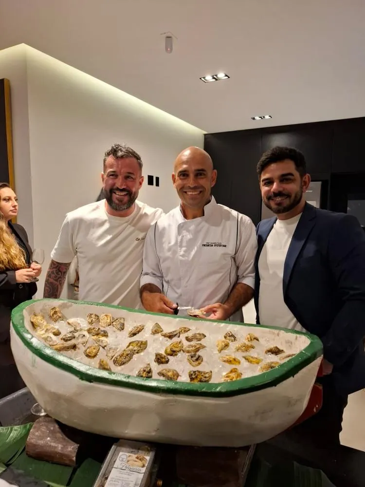 #OSTRAS - O lançamento da nova edição da Revista Ouro Dubai, realizado em Jurerê Internacional, em Florianópolis, reuniu convidados em uma noite marcada por experiências gastronômicas e encontros especiais. Entre os destaques do evento estiveram o Chef Leonardo Costa, do Freguesia Bar, e o Chef Márcio Ricci, renomado chef brasileiro radicado em Portugal e conhecido como o chef das celebridades no país europeu. Os dois chefs protagonizaram um dos momentos mais prestigiados da programação ao preparar um risoto de ostras a quatro mãos, utilizando ostras frescas cultivadas na Fazenda de Ostras Freguesia Bar, no Ribeirão da Ilha, valorizando ingredientes locais com técnica e criatividade. Na foto, também aparece o chef italiano Jean Luca, que esteve presente como convidado do evento. O encontro reforçou a troca de experiências entre profissionais da gastronomia.