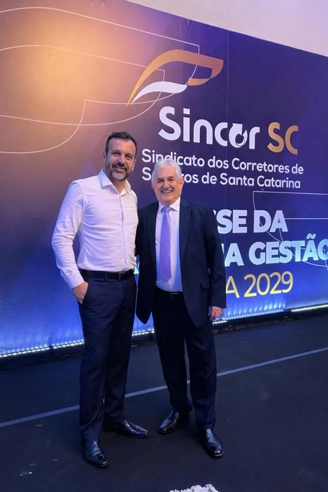 #POSSE - O Sincor-SC festejou na última quinta-feira (26) a posse da diretoria para a gestão 2026–2029. Na foto, Auri Bertelli, presidente da entidade, e Marcelo Tomaz, assessor jurídico, durante a solenidade que marcou o novo ciclo do Sindicato dos Corretores de Seguros de Santa Catarina. Sucesso à nova gestão!